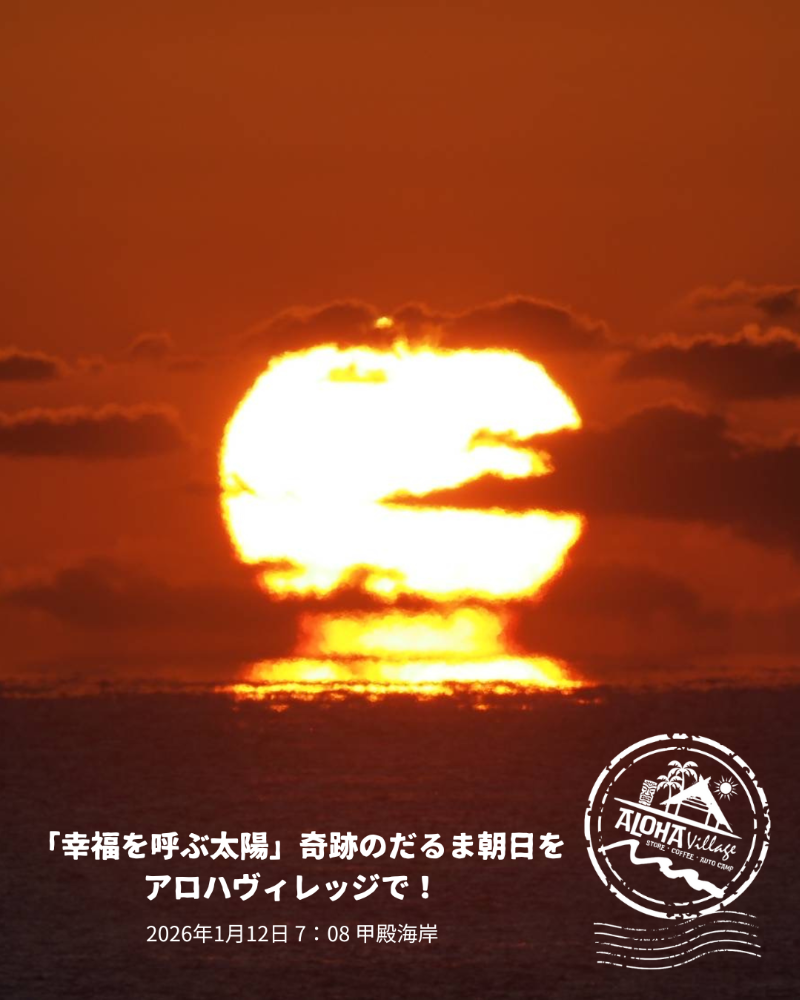 1月12日 7:08分冷え込んだ朝!気象条件が全て揃ったこの日水平線に奇跡の朝日が甲殿海岸に現れました!「幸福を呼ぶ太陽」とも呼ばれ、見ることができたら幸運とされている“だるま朝日”秋分の日(9月23日ごろ)から春分の日(3月20日ごろ)までの、海面と大気の温度差が大きく寒い時期の晴れた朝に見える、光の屈折による蜃気楼の一種だそうです。海と空が燃える朝、甲殿海岸から奇跡のだるま朝日! ぜひ見てみませんか?