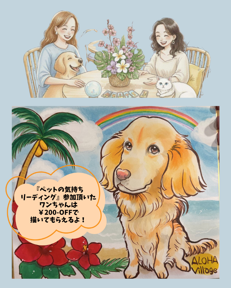 パンライファーの似顔絵プラン!でご好評頂いている“にがおえni-chu”さん!来たる2月28日(土) そらのリズムhealing roomの舞さんとコラボが決定!『ペットの気持ちリーディング 』に参加されたお客様に似顔絵を¥200-OFFにて受付け致します。是非、この機会にアロハヴィレッジへお越し下さい。
