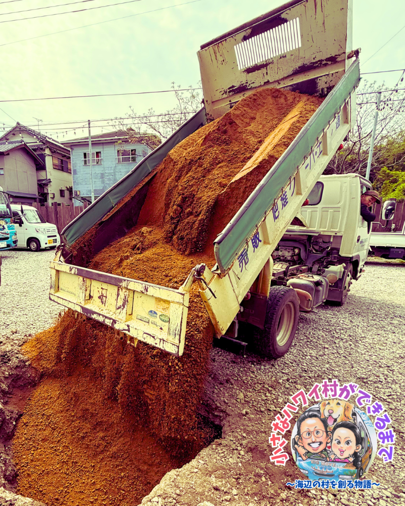 ・新しい命の土: そこへダンプで運び込んだ、真っ新で栄養たっぷりの土を投入。